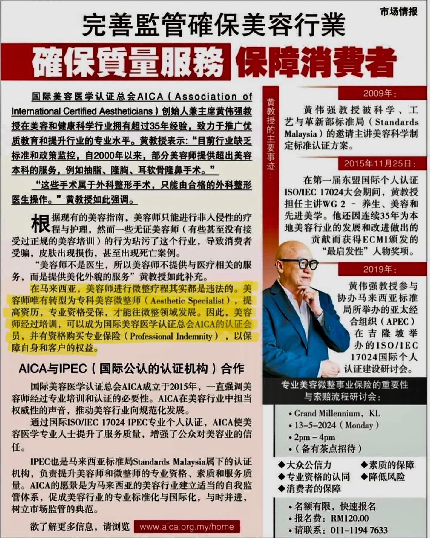 AICA自我监管有益于消费者的保障。AICA提供美容保险确保专业人士(美容师和微整师)的资格。此举也会直接提高美业在社会的公信力。